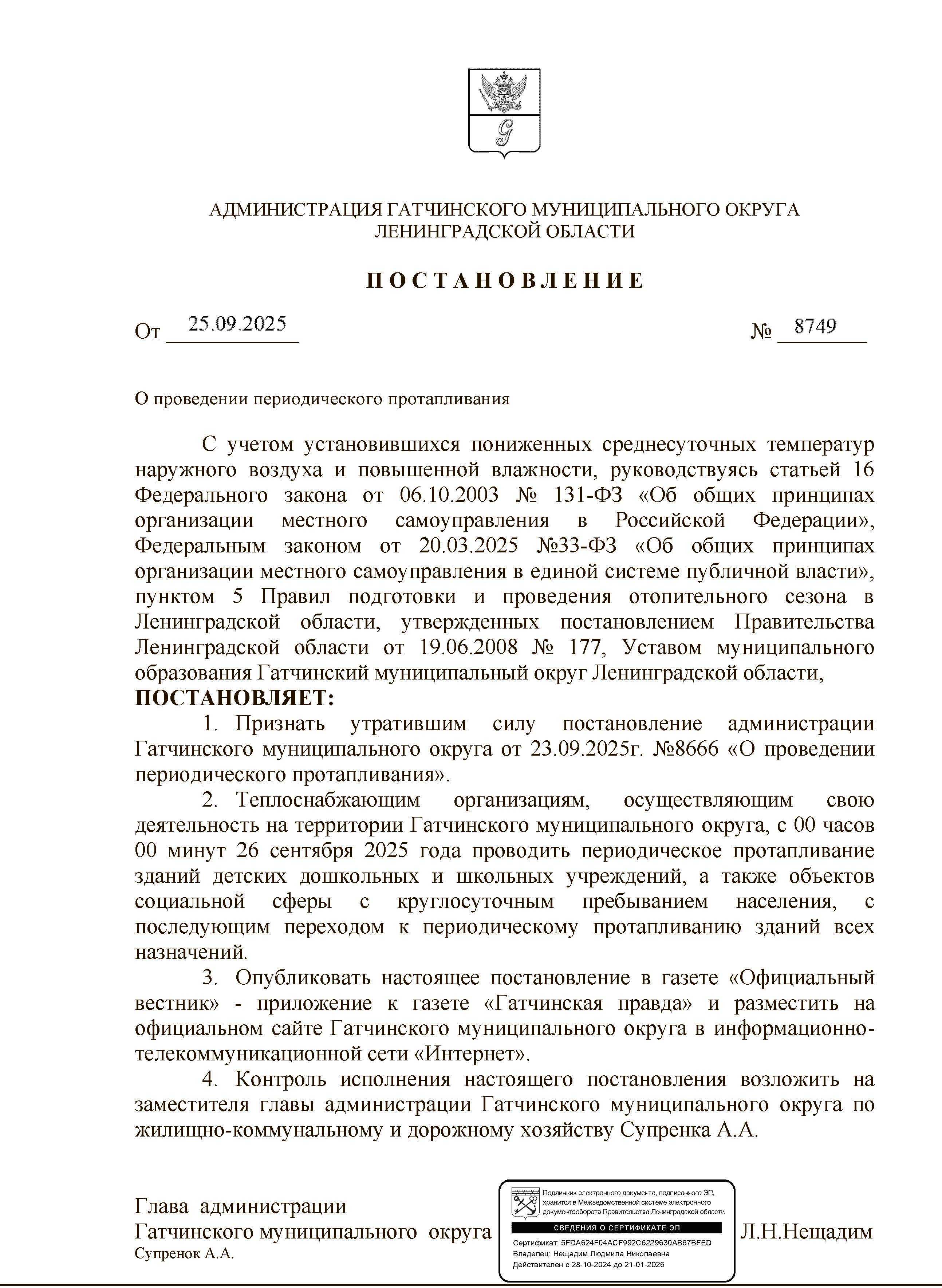 С учётом установившихся пониженных среднесуточных температур наружного воздуха и повышенной влажности администрация Гатчинского муниципального района ЛО постановляет с 00 часов 00 минут 26 сентября 2025 года проводить периодическое протапливание зданий детских дошкольных и школьных учреждений, а также объектов социальной сферы с круглосуточным пребыванием населения.