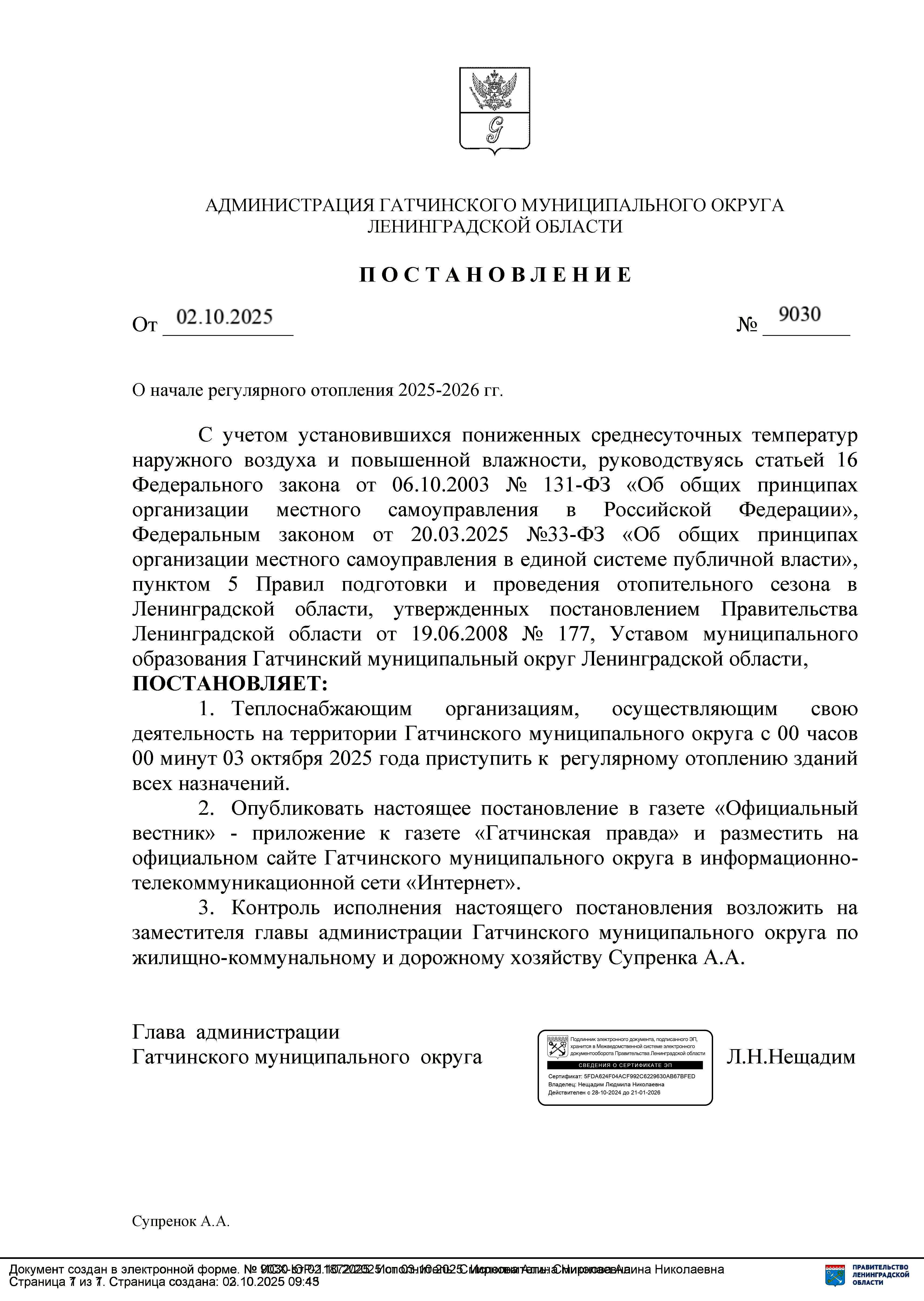 Учитывая метеорологический прогноз о понижении температуры наружного воздуха, согласно постановлению администрации Гатчинского муниципального района Ленинградской области, с 00 часов 00 минут 03 октября 2025 года АО "Коммунальные системы Гатчинского района" приступает к регулярному отоплению зданий всех назначений.
